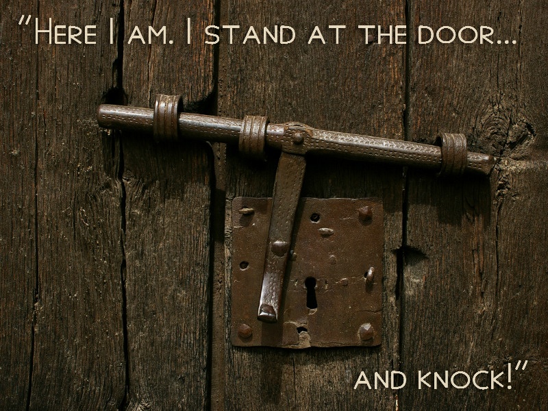 [Jesus to the Christians in the church at Laodicea:] "Here I am! I stand at the door and knock. If anyone hears my voice and opens the door, I will come in and eat with that person, and they with me" (Revelation 3:20).