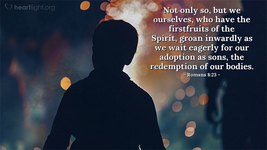 We know that the whole creation has been groaning as in the pains of childbirth right up to the present time. Not only so, but we, ourselves, who have the firstfruits of the Spirit, groan inwardly as we wait eagerly for our adoption to sonship, the redemption of our bodies. (Romans 8:22-23)