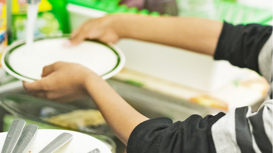 He paused with his hands hovering above the dishwater, water dripping from his almost man hands.