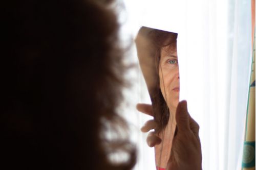 Kimberli looks in the magnifying mirror and sees things she doesn't like on her face and also in her life.