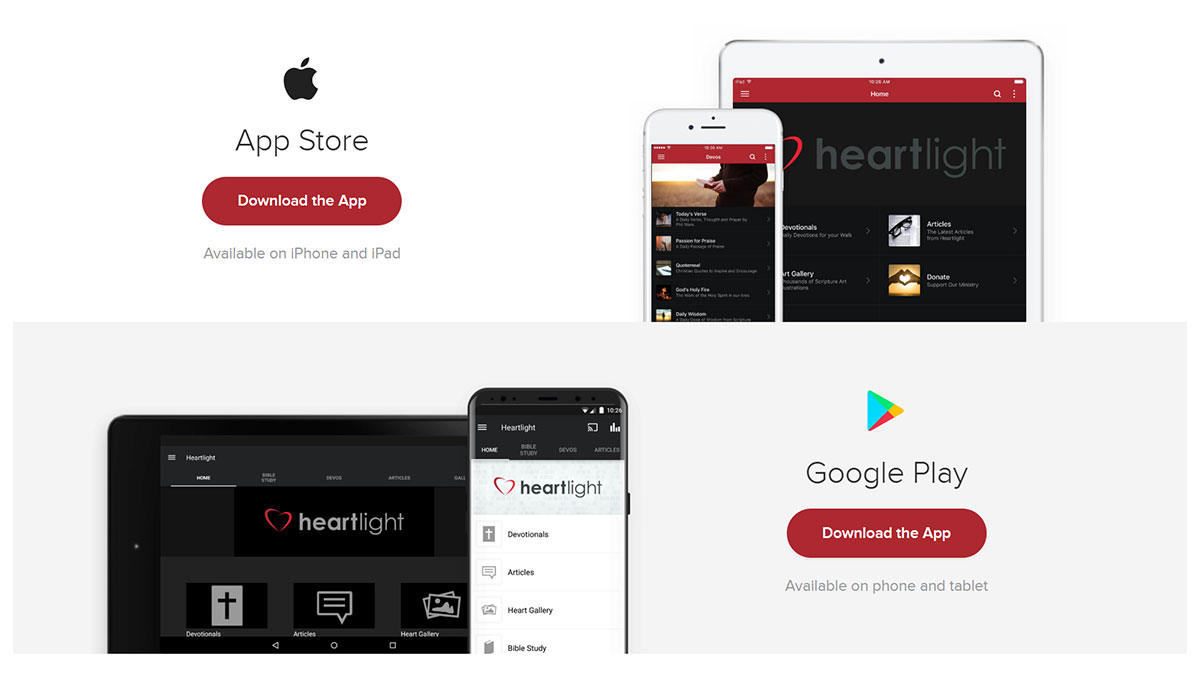 Heartlight's mobile journey started with Heartlight.mobi — an early dedicated mobile site built before smartphones were ubiquitous. As mobile use grew, the entire site moved to a fully responsive design in 2015, adapting seamlessly to any screen size. The Heartlight App followed, bringing devotionals, articles, and artwork into a dedicated experience for iOS and Android. Today, the majority of Heartlight's content is read using a mobile device.
