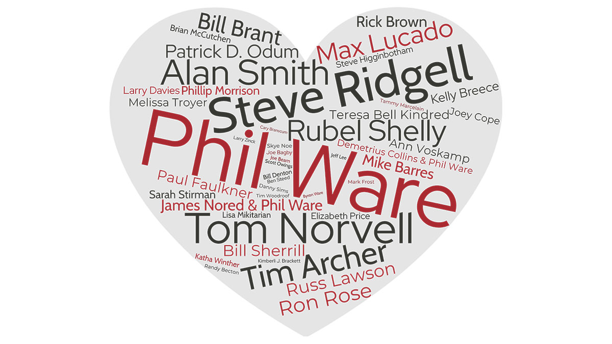 Around 200 authors have contributed to Heartlight over the years, nearly all of them connected through Phil Ware, who served as editor from the beginning. Early contributors like Randy Becton, Paul Faulkner, and Rubel Shelly helped shape the ministry's voice in its formative years. Later, writers like Max Lucado and Ann Voskamp added their work to the library.