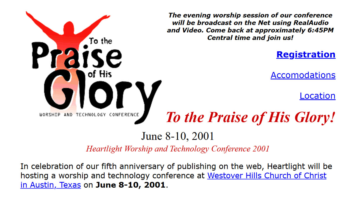 In 2001, Heartlight hosted a one-of-a-kind worship and technology conference called “To the Praise of His Glory” at Westover Hills Church of Christ in Austin — a celebration of the ministry's fifth anniversary online. Church leaders, creatives, and technologists gathered for three days of worship and hands-on classes covering everything from web design to live-streaming church services. The event drew more than 650 people.
