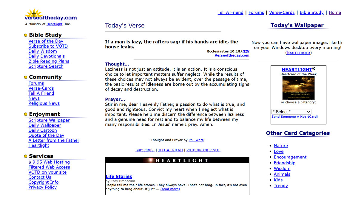 In 2000, VerseoftheDay.com became part of the Heartlight family. Ben Steed joined the ranks as an intern and his website was folded into Heartlight's existing body of work. What started as a quiet addition has grown steadily over the years into a daily touchpoint of Scripture for hundreds of thousands of subscribers across email, app, and beyond.